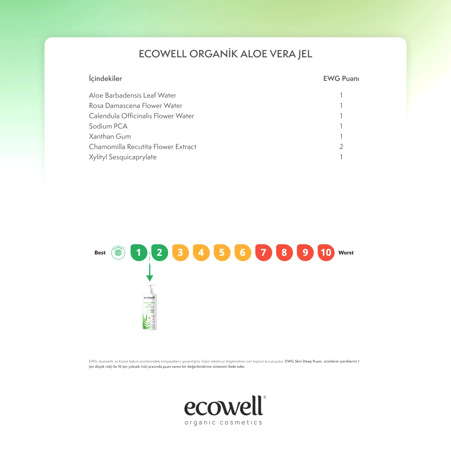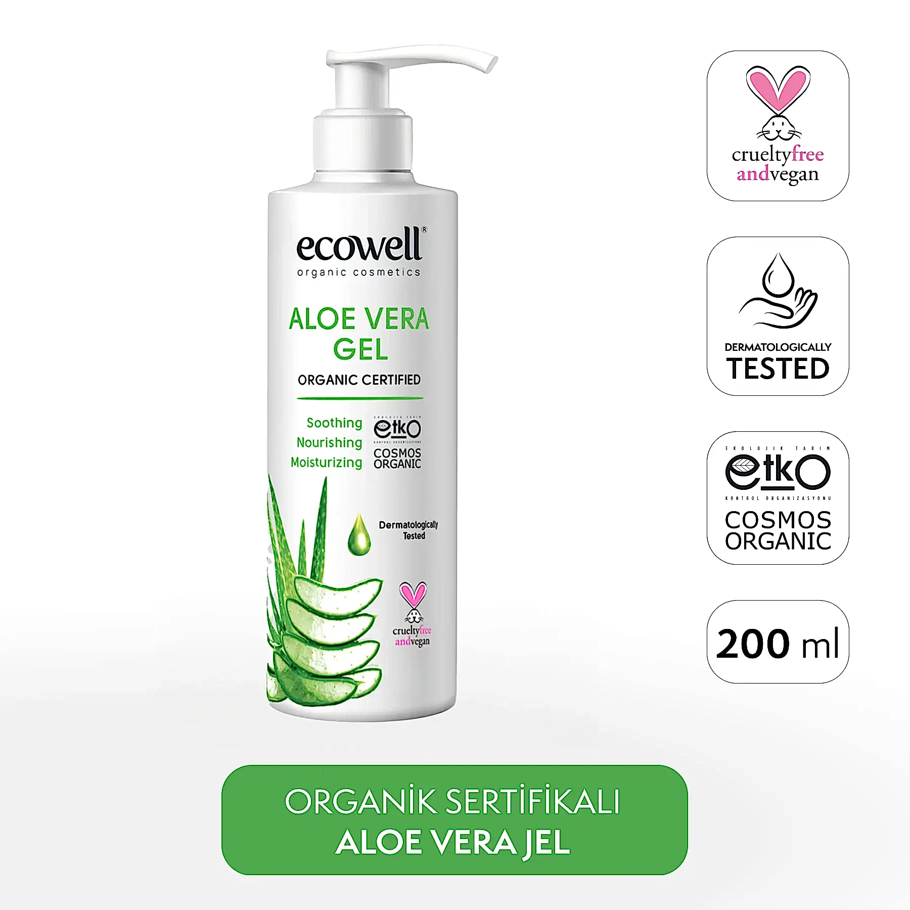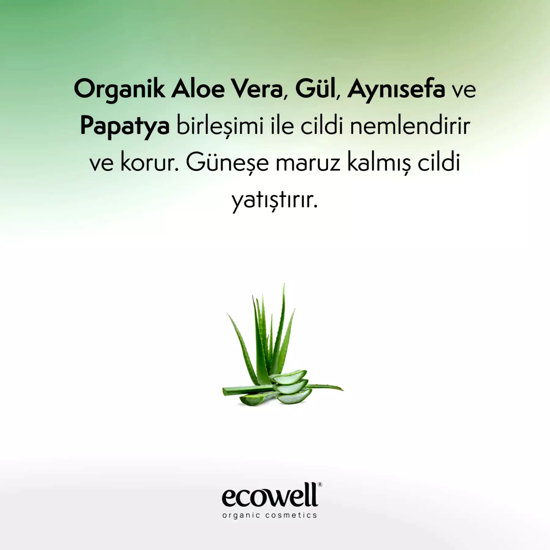 Ecowell Organik Aloe Vera Jel içeriğindeki Organik Aloe Vera, Gül ve Aynısefa ve Papatya ile cildi besler, nemlendirir ve korur. Güneş yanığı gibi çevresel faktörlere maruz kalmış cildi yatıştırır. Cildin doğal nem dengesini destekler. Yapışkan hissiyat ve kalıntı bırakmaz, cildin ipeksi ve yumuşacık olmasını sağlar. Organik içeriği sayesinde bebeklerde güvenle kullanılabilir. Soğuk ve kuru havalarda kuruyan cildi nemlendirir. Yüz ve vücutta kullanıma uygundur.